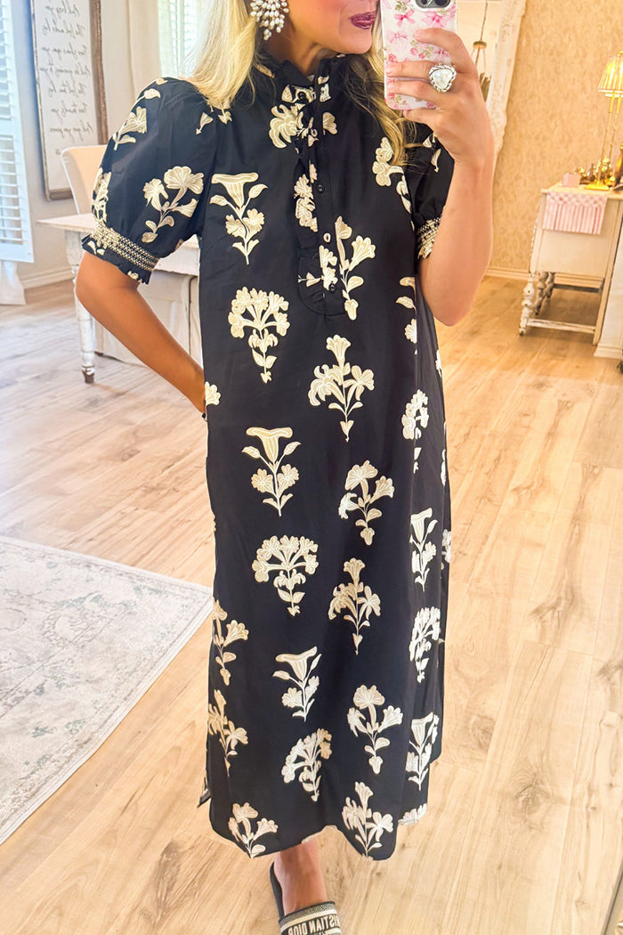 We're glad you've clicked on our new Black Floral Puff Sleeve Midi Dress as we're really into its casual vibes! The Floral cut make this a great choice for any stylish girl.
