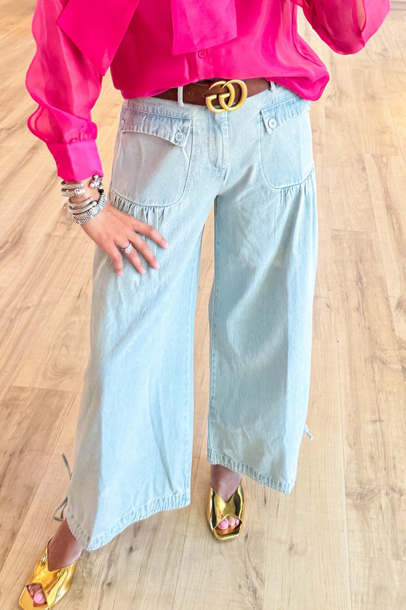 We're glad you've clicked on our new Denim Tie Wide Leg Pants as we're really into its casual vibes! The drawstring waist make this a great choice for any stylish girl.