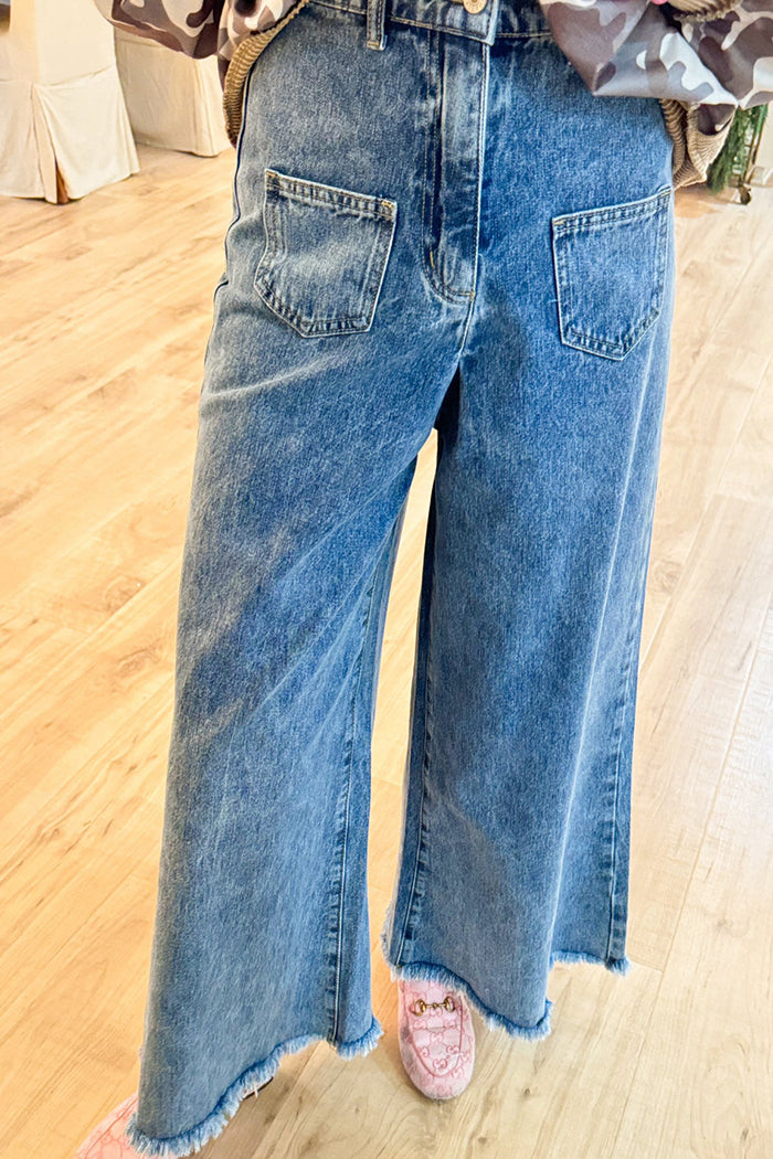 We're glad you've clicked on our new Pocketed Wide Leg Raw Hem Jeans as we're really into its casual vibes! The unique design make this a great choice for any stylish girl.